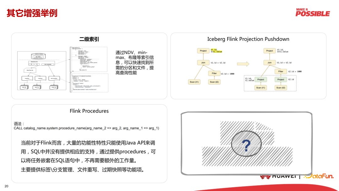 在 Iceberg 里对二级索引的实现还不是很完善,但是很多场景下对主键索引等是有要求的,比如使用 Iceberg 表作为关联表进行 Lookup 查询时,如果没有主键索引,查询代价就会很高;在一些需要根据主键查询出旧数据以判断是否需要进行更新的流式场景下,索引也是必要条件之一。