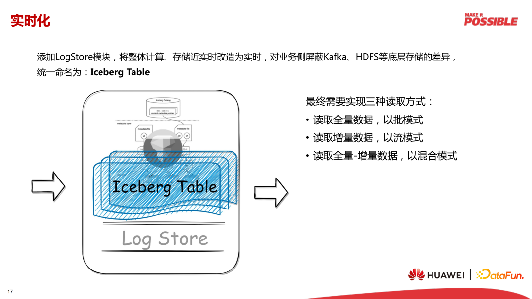 我们将文件存储和 Log Store 存储统一命名为 Iceberg Table。它为上层业务侧屏蔽了 Kafka、HDFS、OBS 等底层存储的差异,提供了统一的实时数据处理、存储方案,业务侧也不再需要为了批流运算对接不同的组件。