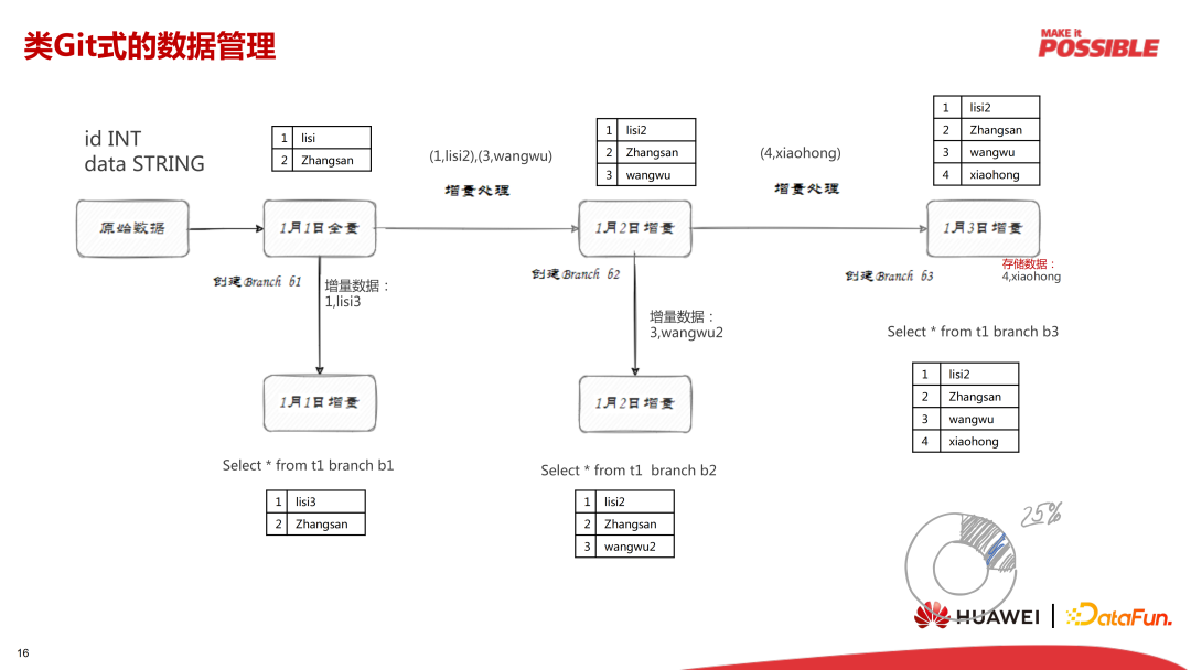 以一个具体的场景为例:业务每天仅有若干新的数据流入,并对部分旧的数据进行更新,但因为要记录每天的历史快照,或一些其它安全等方面的考虑,每一个天分区都保存了一份全量数据,在这个分区里每天的变更数据和历史数据都存储在一起,所以产生大量的冗余,修改时也有较多合并操作,性能较差,此时开发者可利用类 GIT 的管理方式,并配合 Iceberg 批处理中提供的 Spark Merge Info 语义,只修改当天变更的数据(这会是一个典型的行级操作),在一天的数据处理完成后在当天数据之上创建一个天级分支,得益于 Iceberg 的增量存储的特性,在这个天级分区内,未修改的增量数据不会重复存储,极大的降低了表占用的空间。当需要查询或修改某一天的数据时,可以基于当天的分支快速进行时间旅行,非常方便。