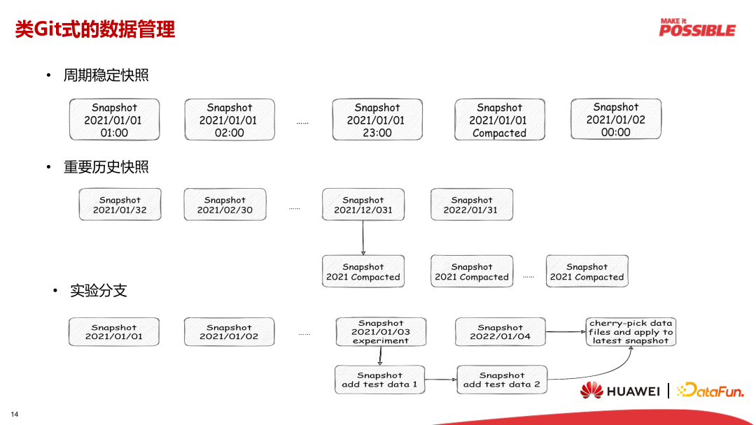我们可以周期的生成稳定、压实的快照,并且对重要时间点的历史快照进行标记,这样一些对过往时间数据的修改回填操作就可以在历史快照分支的基础上进行,而不影响当前分支的数据。对于一些探索性业务,如果修改表结构、配置实验数据的代价太大,开发者往往趋于保守,这不利于进行业务创新,而通过 GIT 式数据管理,我们可以创建实验分支,不再需要重新建新表并导入数据,实验分支上可以随意填入数据或者修改表结构以进行新业务测试,避免了对主数据和表结构的影响。当新业务稳定后,还可以把实验分支上的改动合并到主干分支,这就类似于 GIT 的 Merge、Cherry-Pick 等操作。