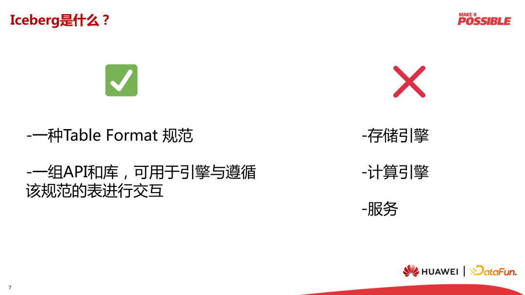 Iceberg 是一种 Table Format 的规范,它是一组 API 和库,可以用于各种计算引擎和遵循该规范的表进行交互。但要注意它并不是一种存储引擎,也不是一种计算引擎,更没有提供直接给业务使用的服务。