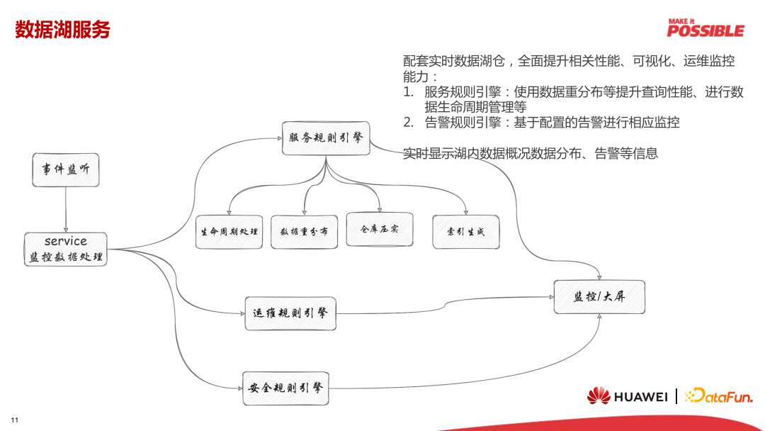 分析上述监听数据的是多套规则引擎:服务规则引擎,用于提供生命周期处理、数据重分布、仓库压实和索引生成等功能;告警规则引擎,包括运维和安全两种,运维引擎主要用于统计 Iceberg 表的数据分布情况,安全规则引擎主要用于配置拦截、转发、权限管理等内容。