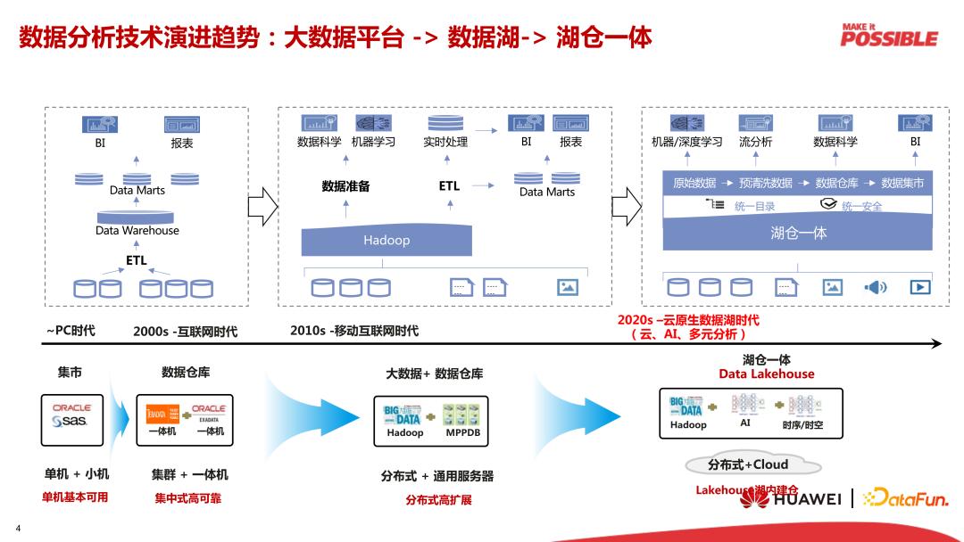 • 最初,数据分析主要集中在数据仓库如 Oracle 一体机等,以结构型数据为主,上层应用主要是 BI 报表;