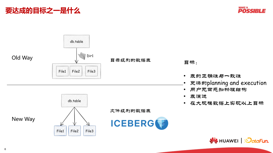 保证表的正确性与一致性;更快的 Planning 和 Execution;用户无需感知物理结构;支持表结构演进;在大规模数据上实现以上目标。最后一点目标至为重要,因为很多问题在小规模的数据集上无法暴露,或者无关紧要,而随着数据规模的暴涨,逐渐开始成为制约性能、体验的关键点。