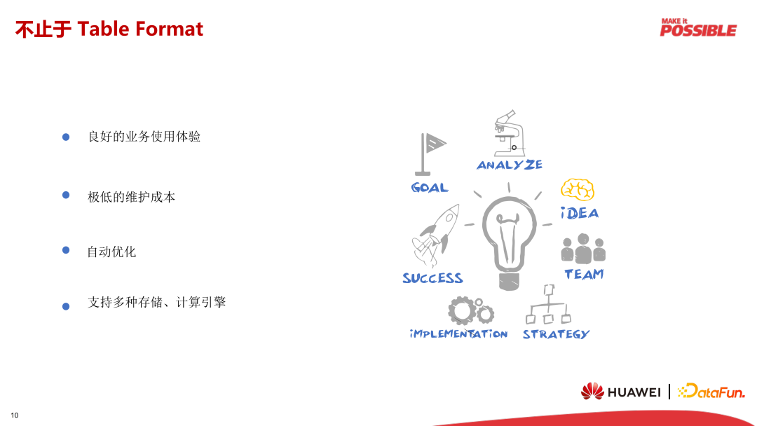 其实,仅仅使用 Iceberg 本身是远远不够的,一种方案是否可以商用,还涉及到方方面面,比如能否提供良好的业务使用体验和极低的维护成本,支持底层文件布局的自动优化和对接多种存储、计算引擎等。