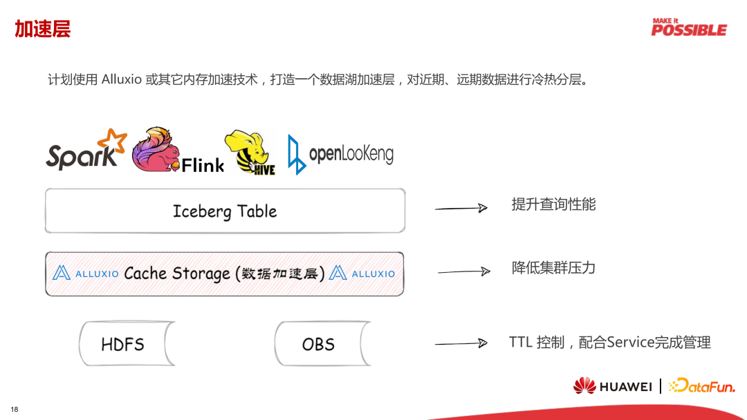 利用 Alluxio 或者其他内存加速技术,可以打造一个数据湖加速层,通过对近期和远期的数据进行冷/热分层,放到不同的存储中,能够对查询进行加速,并且降低集群的压力。