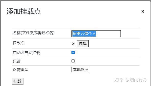 四、登录阿里云盘后选中阿里云盘 点击显示器图标并设置挂载点里面的名称、挂载点、默认启动时自动挂载,不用的可以把勾去掉,最后点挂载就可以了。