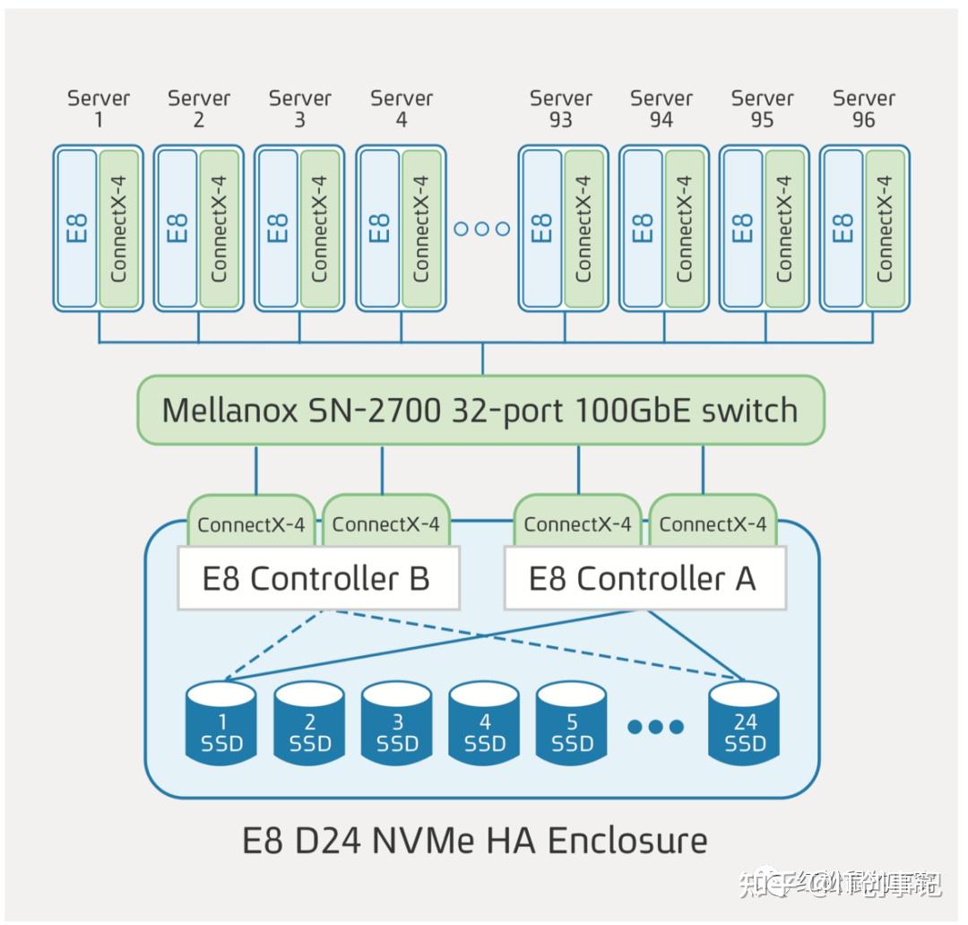 “云存储”不但参数的“面子”越来越像企业存储,架构的“里子”也是如此。AWS自2012年推出 IO1后8年没有新产品,但收购存储厂商E8 Storage获得其硬件能力并将其CEO任命为块存储研发总监后1年多时间就推出了IO2和IO2 Express2。以下为被AWS收购的E8 Storage存储架构,关于云存储架构与企业存储的趋同趋势分析详见"浓眉大眼的叛变"一节: