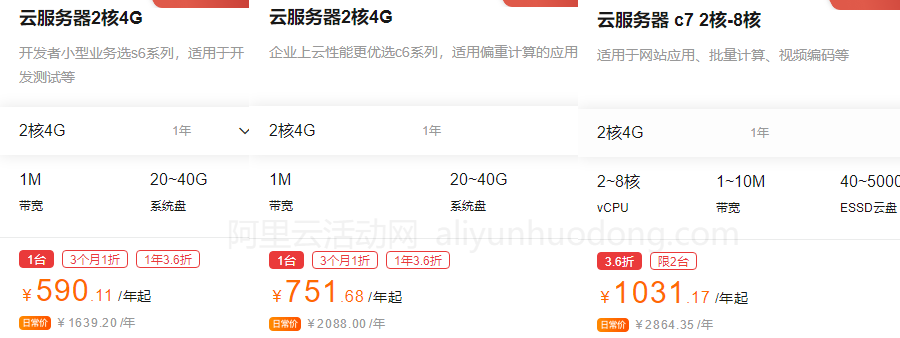 当我们通过阿里云活动去购买阿里云服务器的时候,如果我们计划购买的配置是2核4G、4核8G或者8核16G时会发现有共享型s6、计算型c6、计算型c7三种实例规格可选,虽然配置相同,但是实例规格不同,价格相差还是很大的,例如同样是2核4G配置,目前阿里云活动中选择共享型s6实例的年付价格是590.11元/1年起,选择计算型c6实例的价格是751.68元/1年起,而选择计算型c7实例的价格是1031.17元/1年起,计算型c7实例的价格比共享型s6实例的价格高出了441.06元,如下图所示: