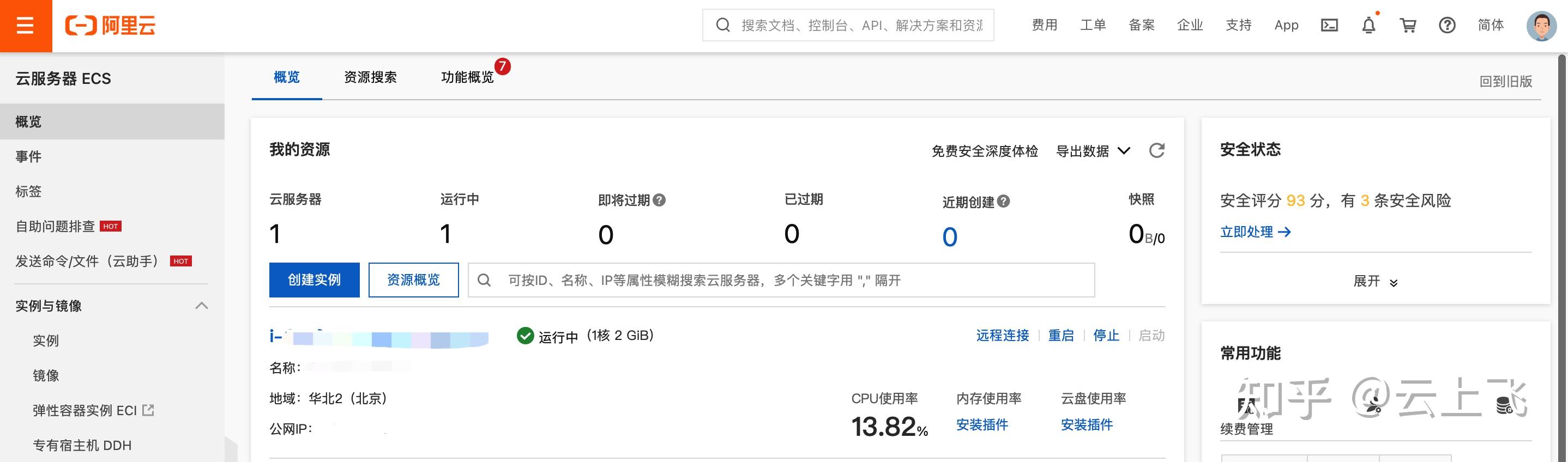 阿里云的控制台交互界面以文字功能应用和云服务器状态展示,以运维效率为主。