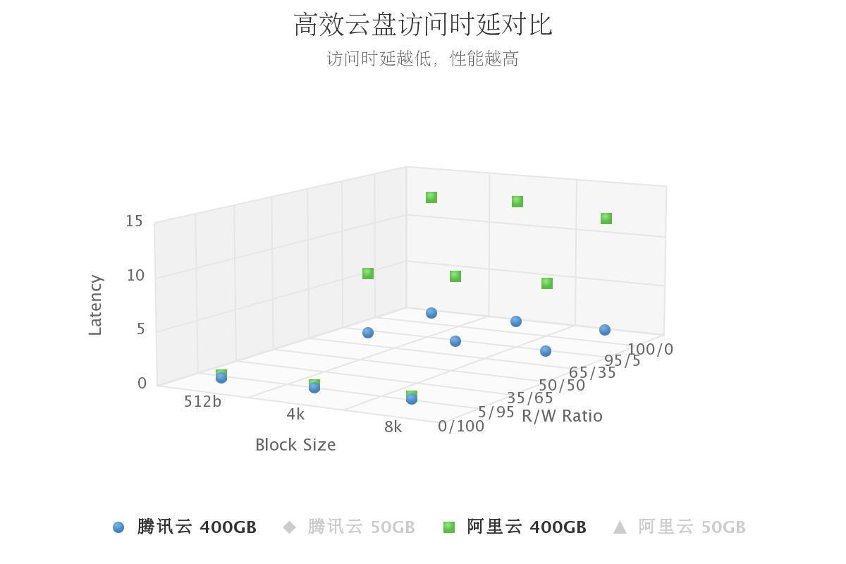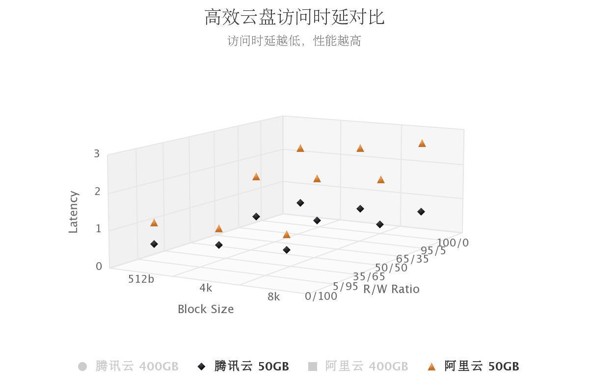 • 腾讯云高效云盘达到了预期的性能,而阿里云部分云盘没有达到,400GB 容量的时延过高;