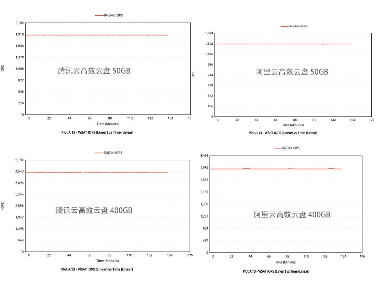 两家高效云盘的 IOPS 表现均比较稳定,几乎呈一条直线,只有阿里云的 400GB 云盘有些略微波动