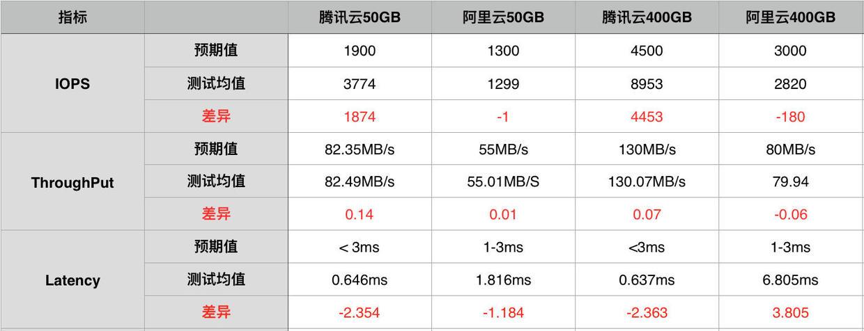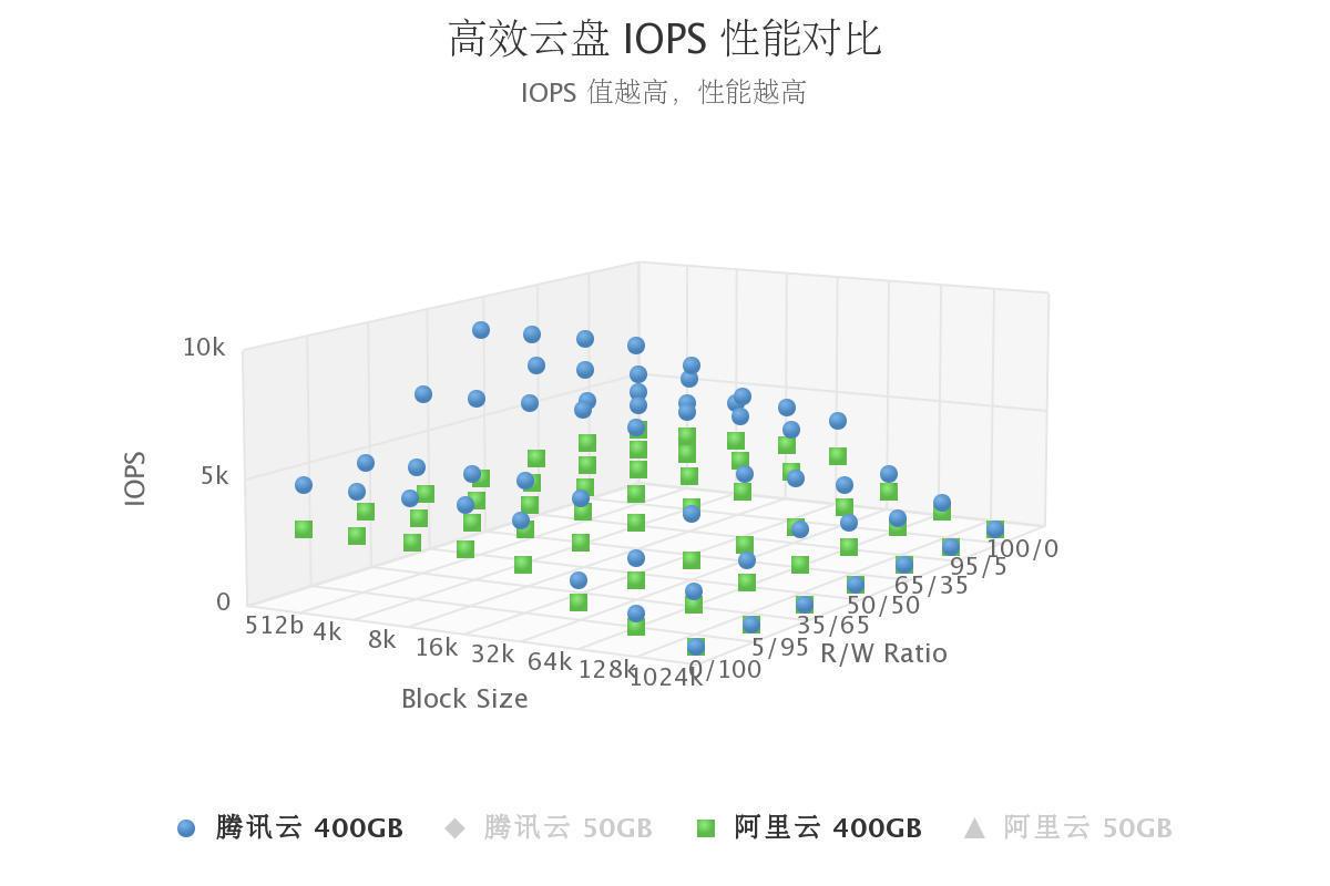 上文中,我们分别从 IOPS、Throughput、Latency、WSAT、HIR 五项测试指标,对腾讯云、阿里云的 50GB、400GB 容量的高效云盘进行了性能对比。